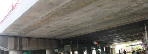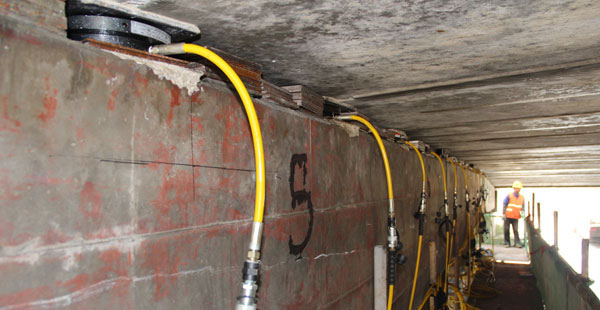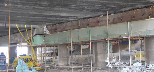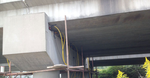 江廣高速公路改造工程JG-GG-2標(biāo)許莊周梓中溝中橋,采用24點同步頂升系統(tǒng)及千斤頂104臺將原有橋梁抬高50mm及舊支座進行更換,此項目為泰州市重點城建項目、國家高速主干道京滬高速江都至廣陵段(簡稱江廣高速)改擴建工程, 此次工程將對該橋進行拼寬拓孔,即在原有位置往東側(cè)增加4孔,加長86米。
